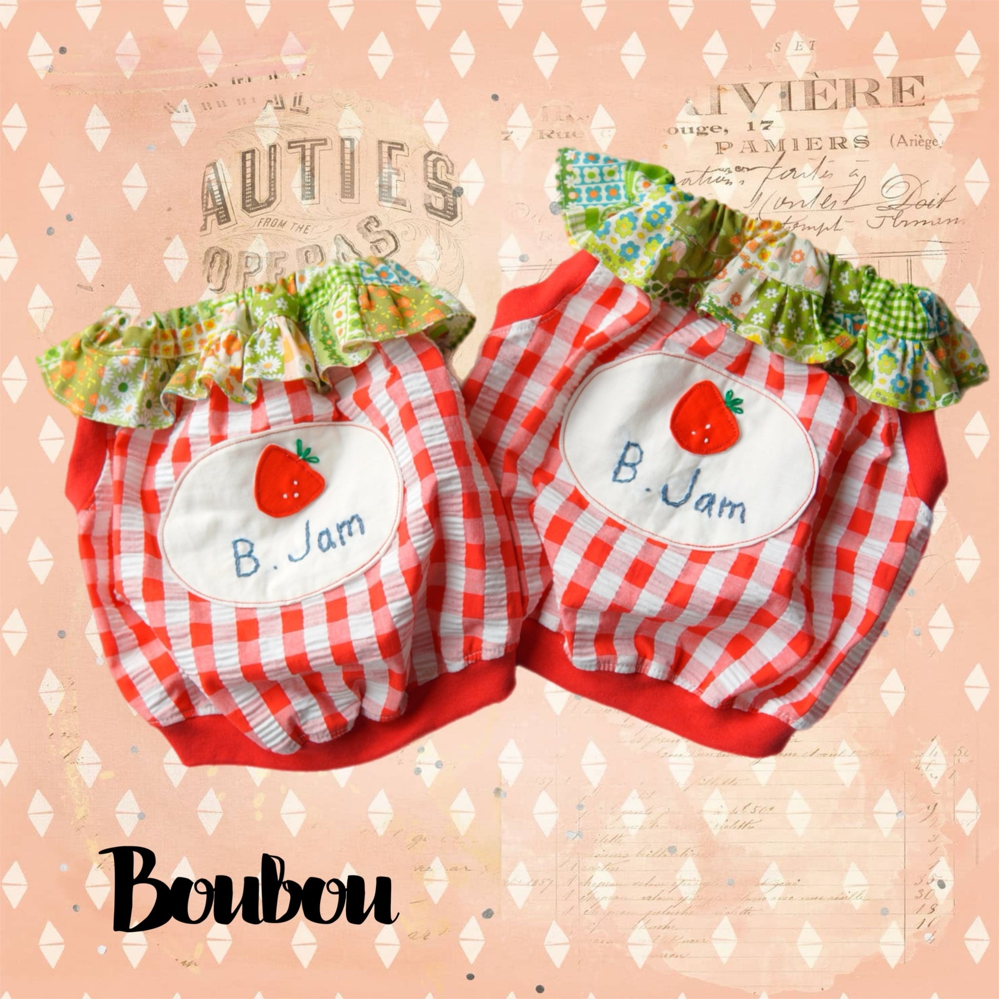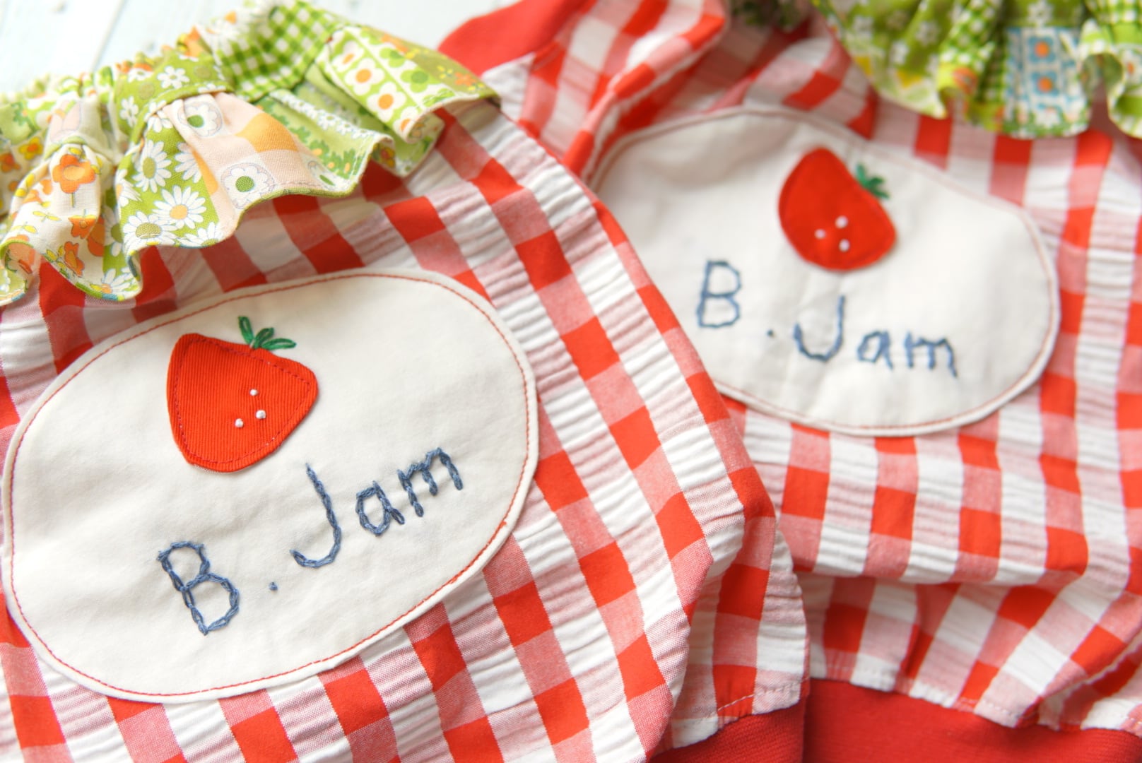 赤のギンガムチェックに、手刺繍の「B.Jam」といちごワッペンを合わせて、まるでジャムのラベルのようなデザインに仕上げました。